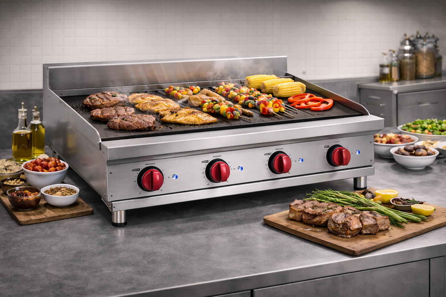 Endüstriyel elektrikli ızgara modelleri düz plaka, oluklu plaka veya yarı düz – yarı oluklu seçeneklerle sunulabilir. Bu çeşitlilik sayesinde farklı menü konseptlerine uygun esnek kullanım sağlanır.