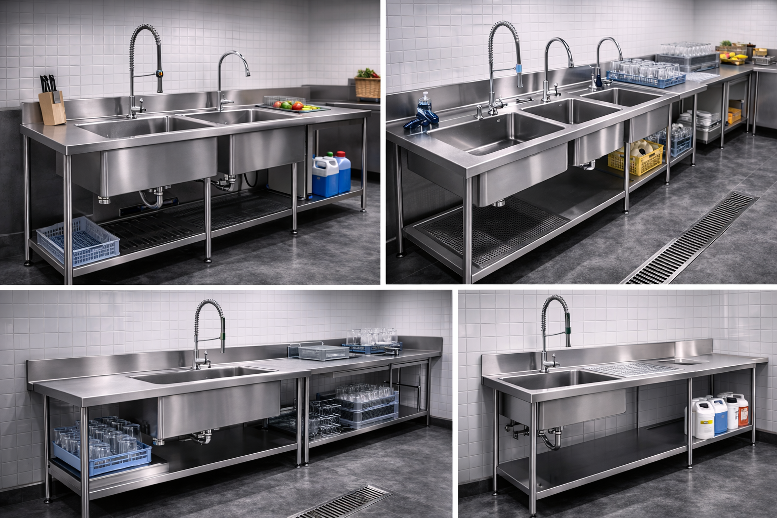 Profesyonel kullanım için tasarlanan evye sistemleri, işletmenin ihtiyacına göre farklı model ve ölçülerde üretilir. Tek gözlü modeller daha küçük alanlar için ideal çözümler sunarken, çift veya üç gözlü sistemler yoğun üretim yapan işletmeler için uygundur.