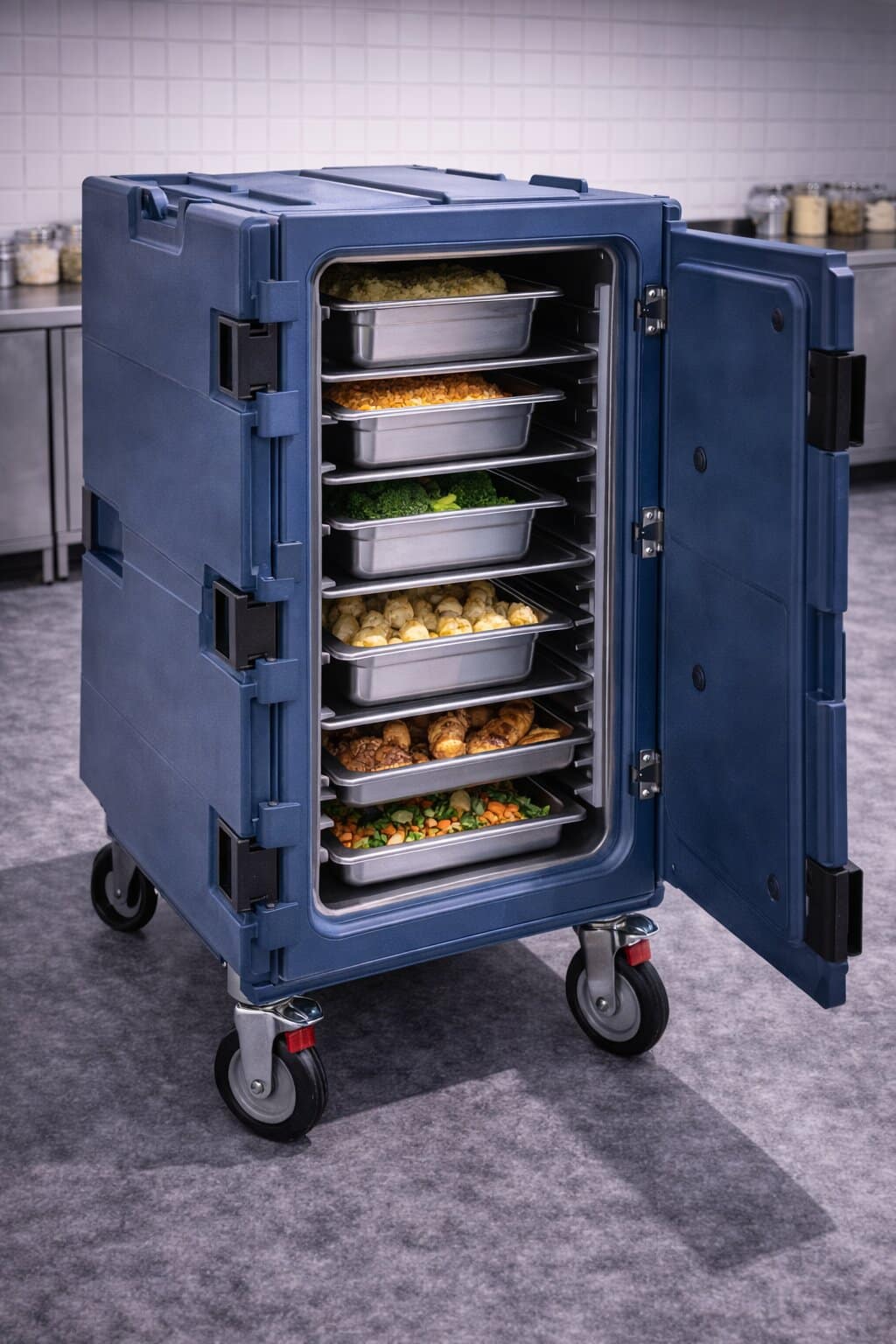 Çok katlı raf veya GN uyumlu ray sistemi, yemek kaplarının ve küvetlerin düzenli şekilde yerleştirilmesine imkan tanır. Bu düzen, taşıma sırasında kayma veya devrilme riskini azaltır. 360 derece dönebilen tekerlek sistemi dar alanlarda kolay manevra sağlarken, kilitlenebilir tekerlek özelliği sabit kullanım gerektiğinde güvenliği artırır. Böylece hem personel güvenliği hem de ürün bütünlüğü korunur.